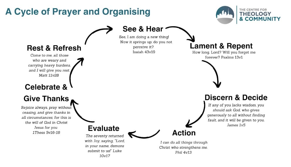 Prayer is not just as an ‘add on’ but an essential part of any action we take. CTC’s Cycle of Prayer and organising shows how prayer can stand at the heart of the whole of our work, helping us discern where God is calling us – not just at the end, asking God to bless what we have already decided to do!