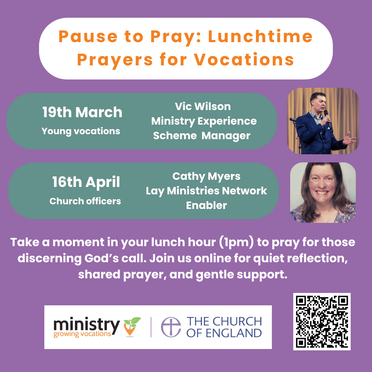 To receive monthly news, resources and prayers from the National Vocations Team sign up to their newsletter. Details of how to do this are here – Vocations resources and events | The Church of England.